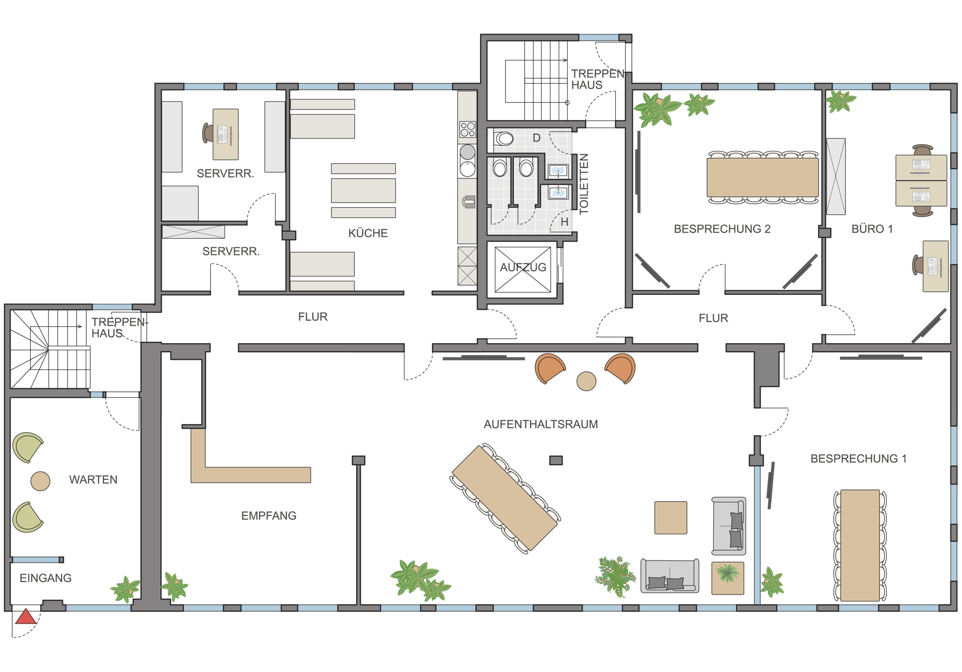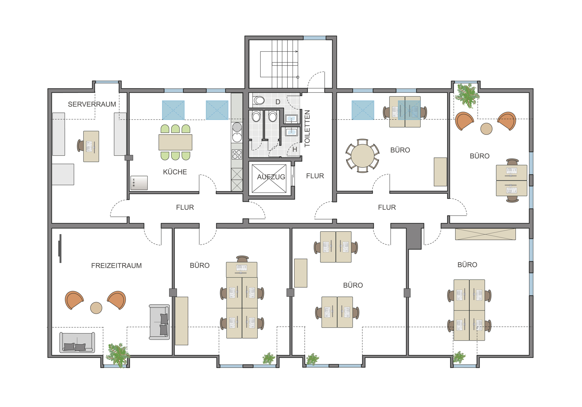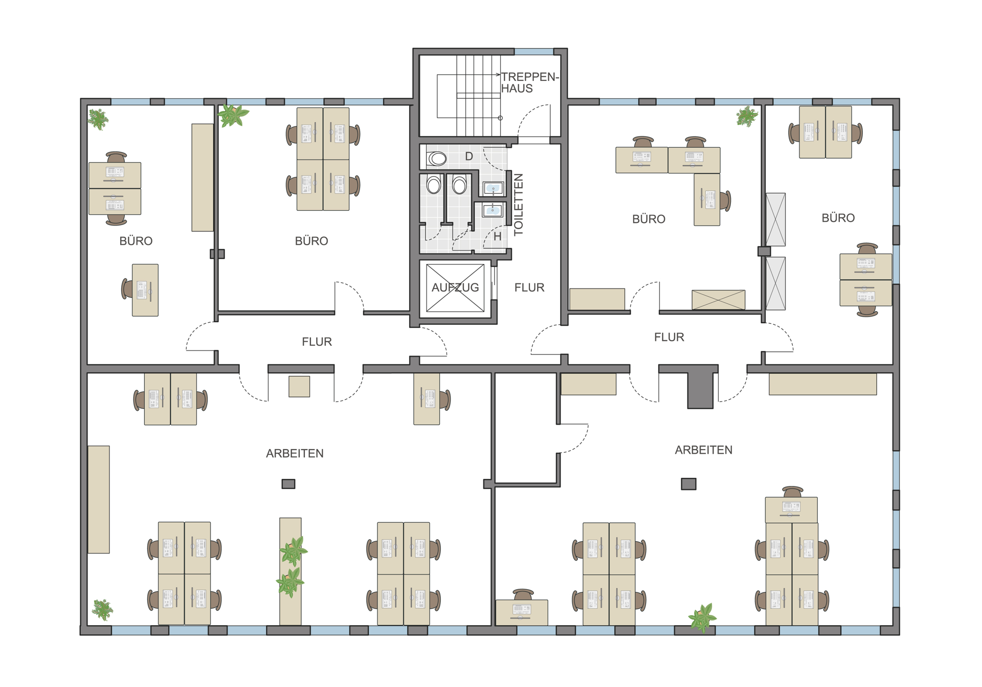 - variable Büroaufteilung in Einzel- und Großraumbüros-