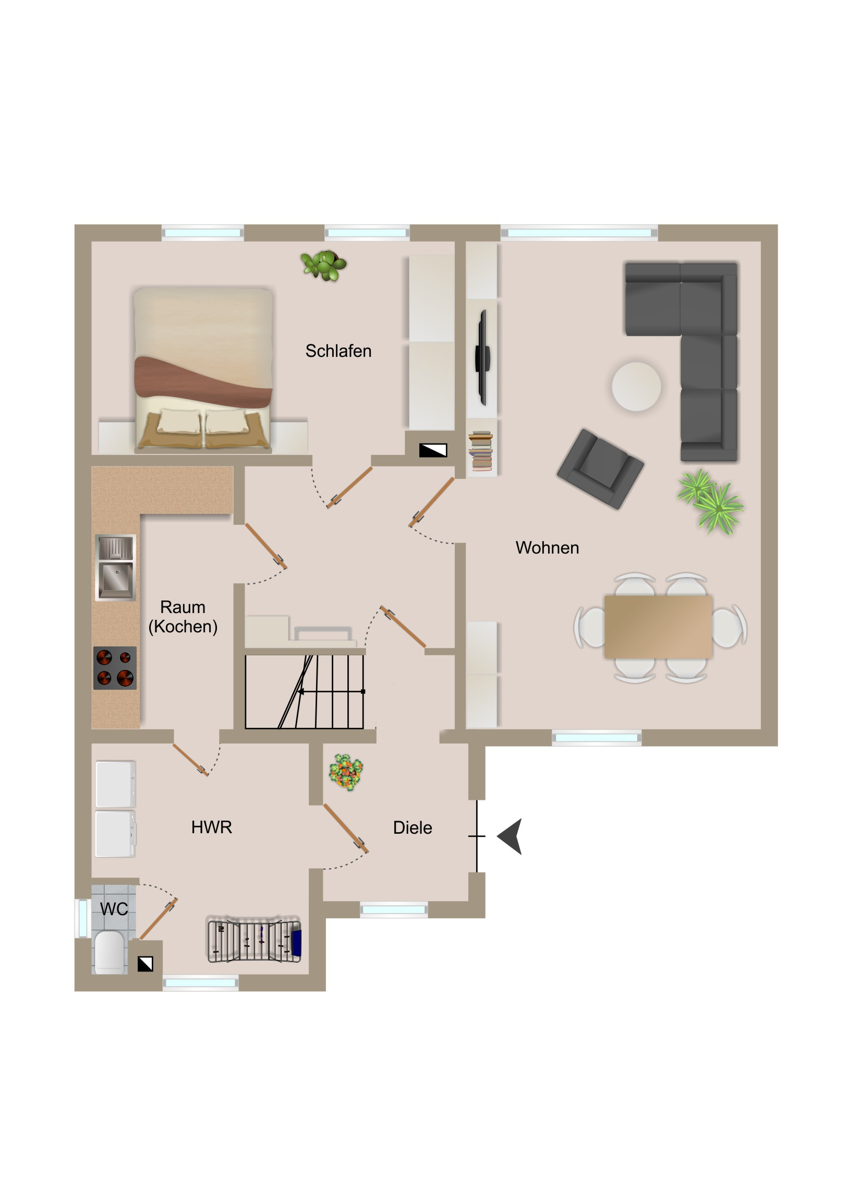 Das Erdgeschoss erreichen Sie durch eine praktische Diele, von wo aus es einerseits in den Hauswirtschaftsraum, mit abgeschlossenes Gäste-WC, und andererseits in den Flur zu den übrigen drei Zimmern geht. Diese wurden genutzt als Küche , Wohnzimmer und Schlafzimmer.