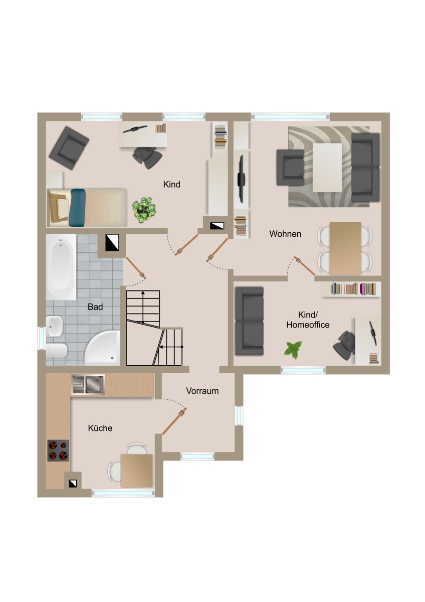 Über eine beleuchtete Holztreppe erreichen Sie das Obergeschoss. Dieses präsentiert sich mit einer Küche inkl. Vorraum, zwei großzügigen Wohnräumen, wobei einer geteilt wurde, sowie einem voll ausgestattete Tageslichtbad. Das Bad mit Wanne und Dusche hat mit seiner Farbgebung einen modernen Charakter.