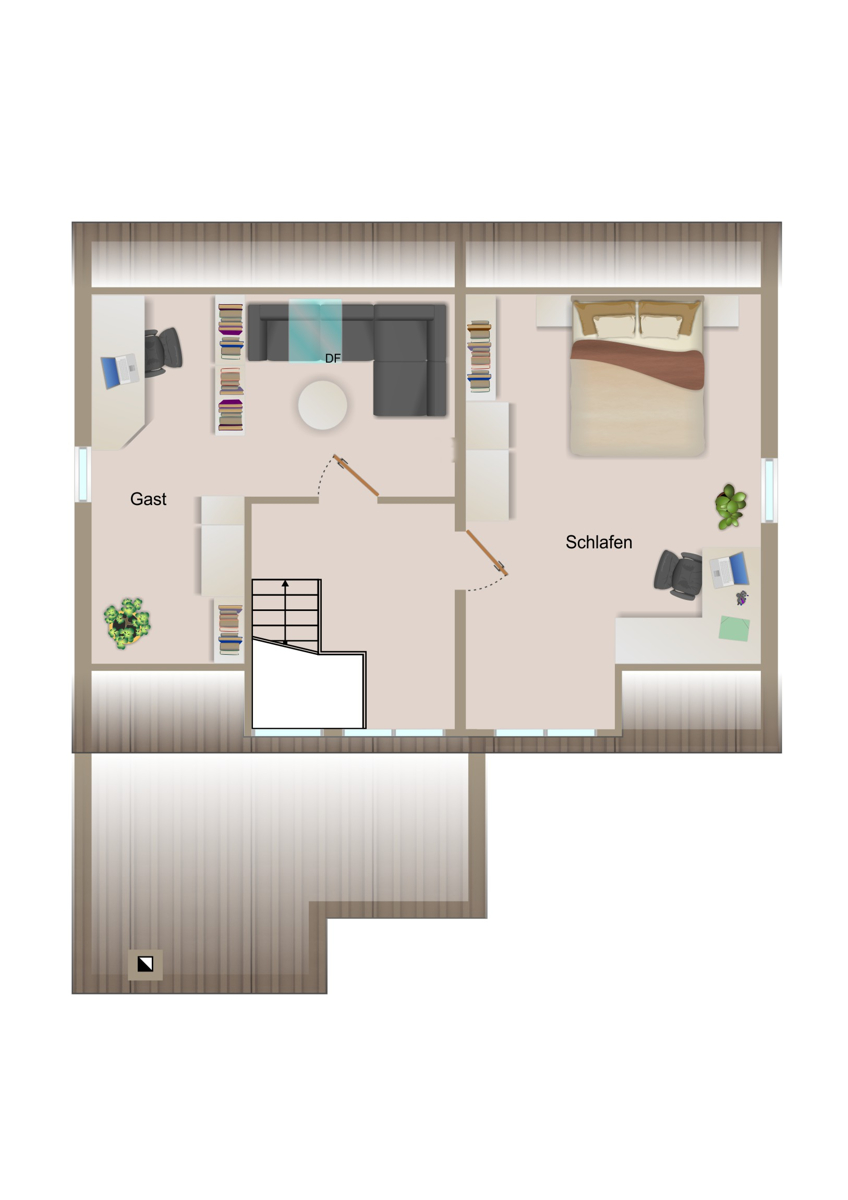 Der darüberliegende Dachboden wurde 1998 komplett ausgebaut und verfügt über ein Gästezimmer ( Homeoffice), ein sehr geräumiges Schlafzimmer und der großzügigen Dachterrasse.