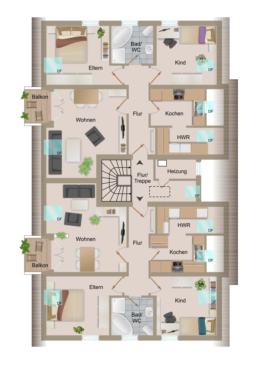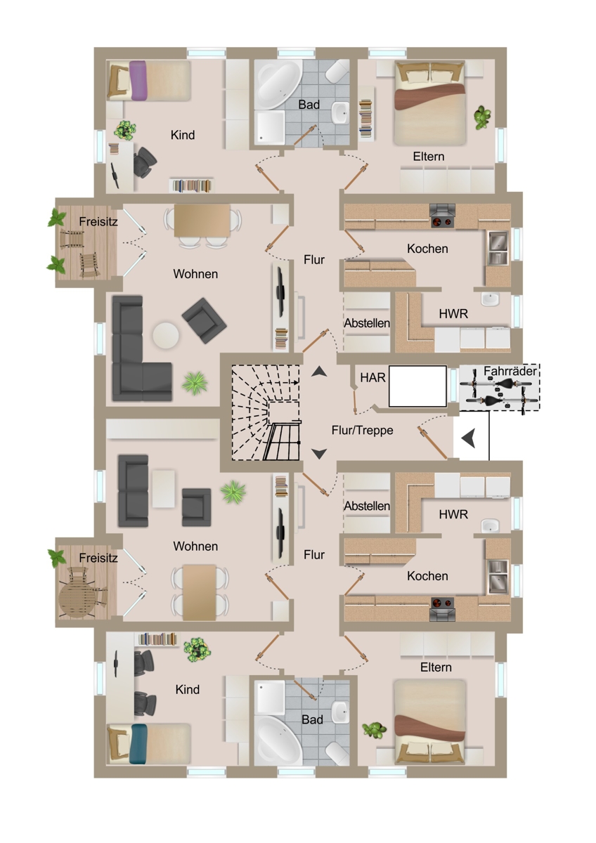 Die 4 Wohnungen des Hauses verteilen sich auf EG und DG und verfügen jeweils über 3 Zimmer, Küche, HWR, Tageslichtbad mit Wanne und Dusche sowie einen Balkon bzw. Terrasse. Jede Wohnung hat darüberhinaus noch einen Abstellbereich. Die Räume verteilen sich im EG jeweils auf 80m² und im DG auf je 68,5m² Wohnfläche.