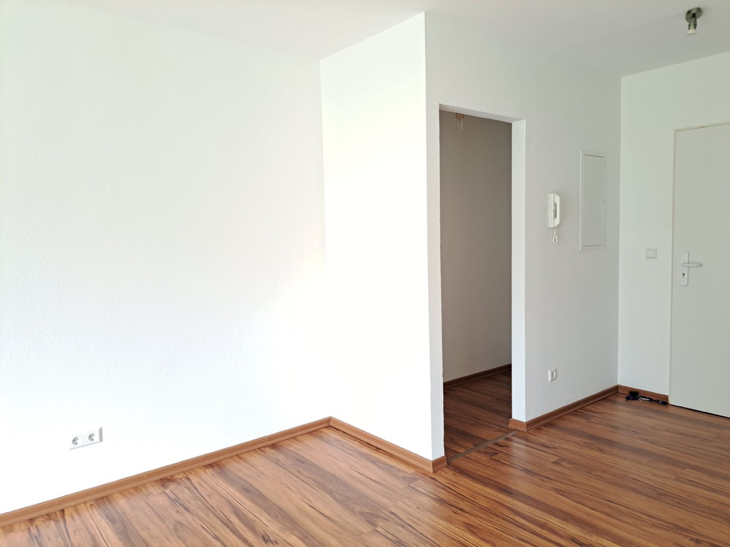 Wohnbereich und Flur sind mit Laminat ausgelegt, der offene Küchenbereich und das Bad sind gefliest. Das innenliegende Bad ist mit einer Dusche und einem Waschmaschinenanschluss ausgestattet. Ein Abstellbereich im Flur schafft zusätzlichen Stauraum. Die große Terrassentür sorgt für jede Menge Licht im Wohnraum und einen schönen Blick ins Grüne. Alle Fenster sind mit Außenjalousien ausgestattet und sorgen so für eine mögliche Verschattung. Ende April wird eine nagelneue Einbauküche in der Wohnung verbaut. Lediglich der Kühlschrank ist aus hygenischen Gründen vom Mieter selbst zu stellen.